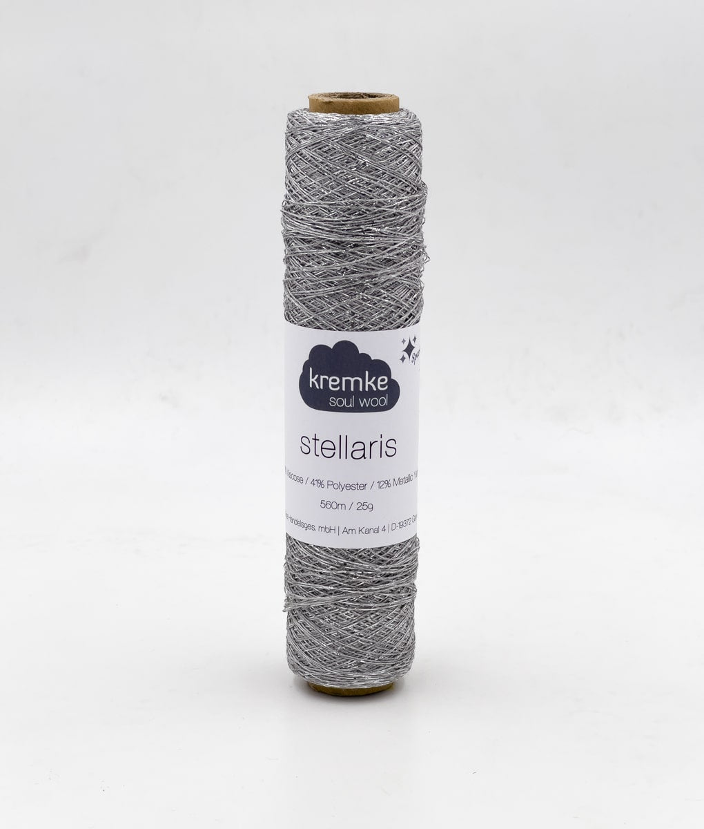 Kremke Stellaris - tai dekoratyviniai, blizgūs mezgimo siūlai iš Vokietijos. Šie siūlai suteiks jūsų mezginiui ar nėriniui subtilaus žvilgesio. Galima megzti kartu sudėjus 2 arba 3 Stellaris siūlų gijas. Taip pat galima megzti kartu su kitais siūlais: vilna, medvilne ar moherio siūlais. Rekomenduojama mezginius skalbti rankomis.